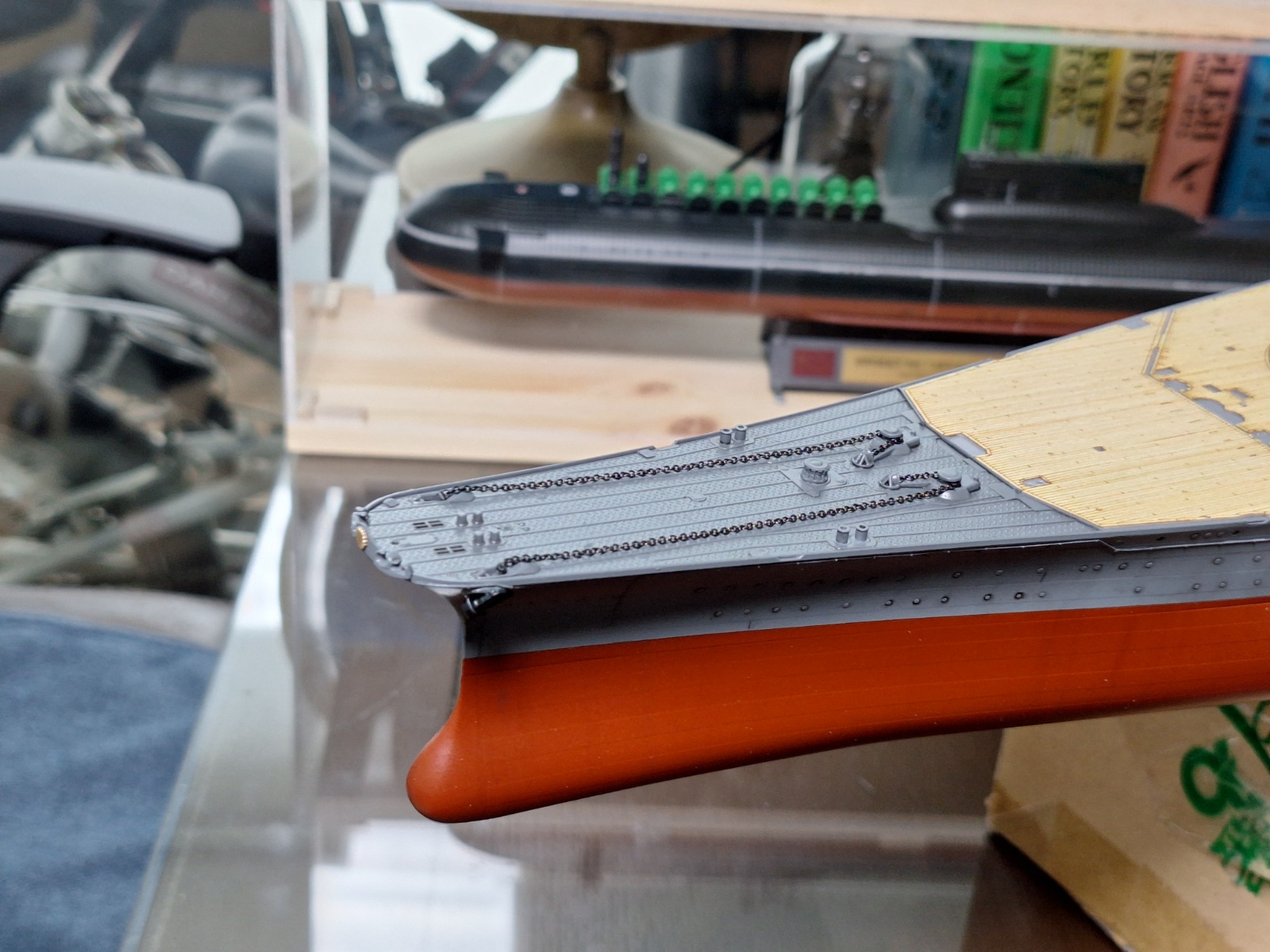 별매 목갑판을 부착해 줬습니다. 사실 아무것도 아닌데, 저는 이것을 처음 접해보는 터라, 조금 걱정이 앞서긴 했었습니다. 한번 붙으면 떼내기가 어렵다고들 하시는 터라, 더욱 긴장이 됬었지요..ㅎㅎ 팁을 하나 본 게 있는데 부착면에 물을 좀 묻힌 후에 부착하면 그래도 바로 부착이 되지 않기 때문에 조금씩 위치를 잡을 수 있다는...그렇게 하였고, 결과는 그럭저럭 부착을 성공하긴 했습니다만, 무엇이 문제인지 약간 짧습니다. ㅎㅎ 선수부터 맞춰 나갔는데 아무리 잘 맞춰도 선미 부분에 대략 1mm 정도 짧더군요...이건 목갑판에서 불필요한 부분으로 제거된 부분을 맞게 재단해서 채워 넣었습니다.