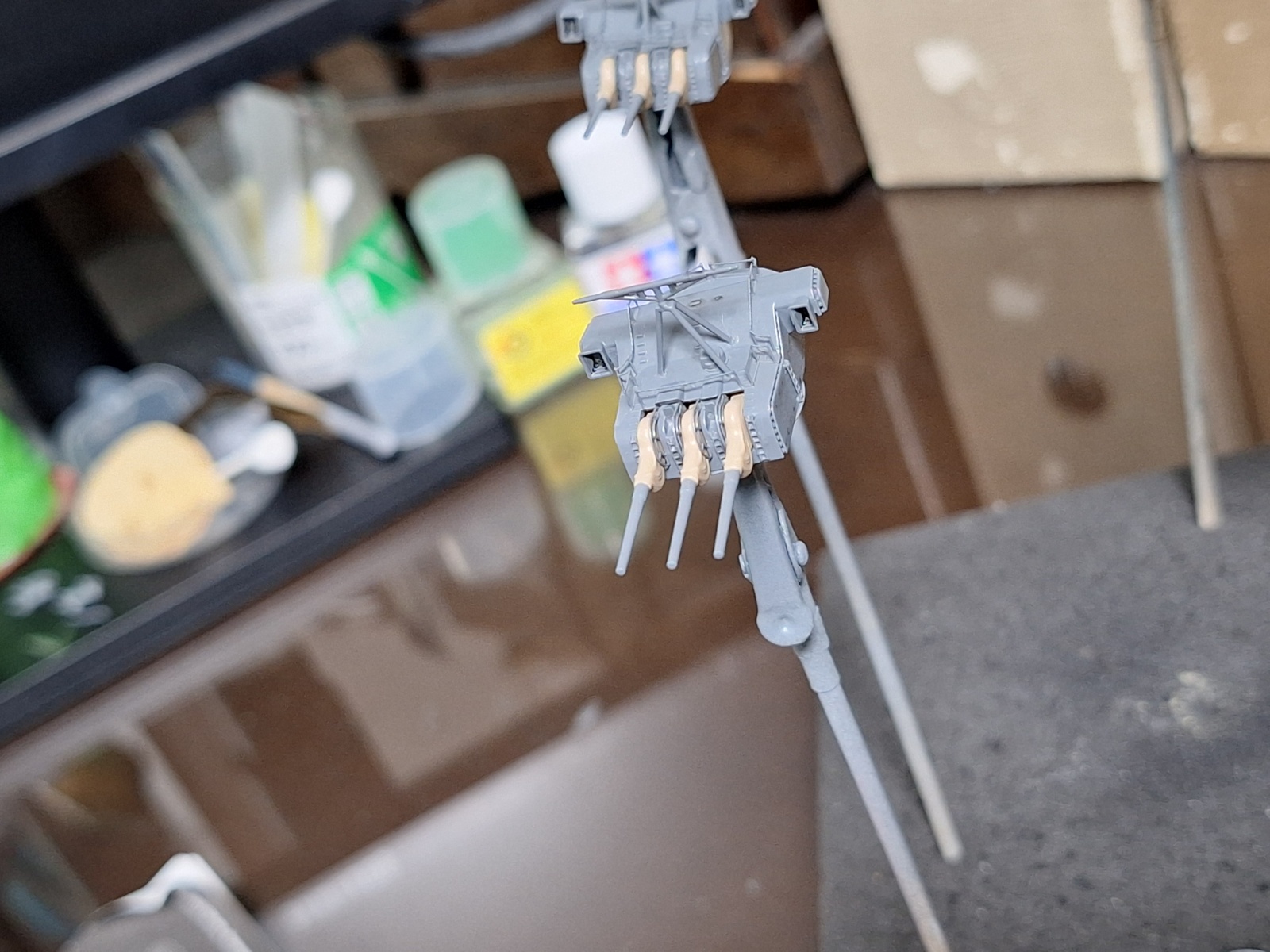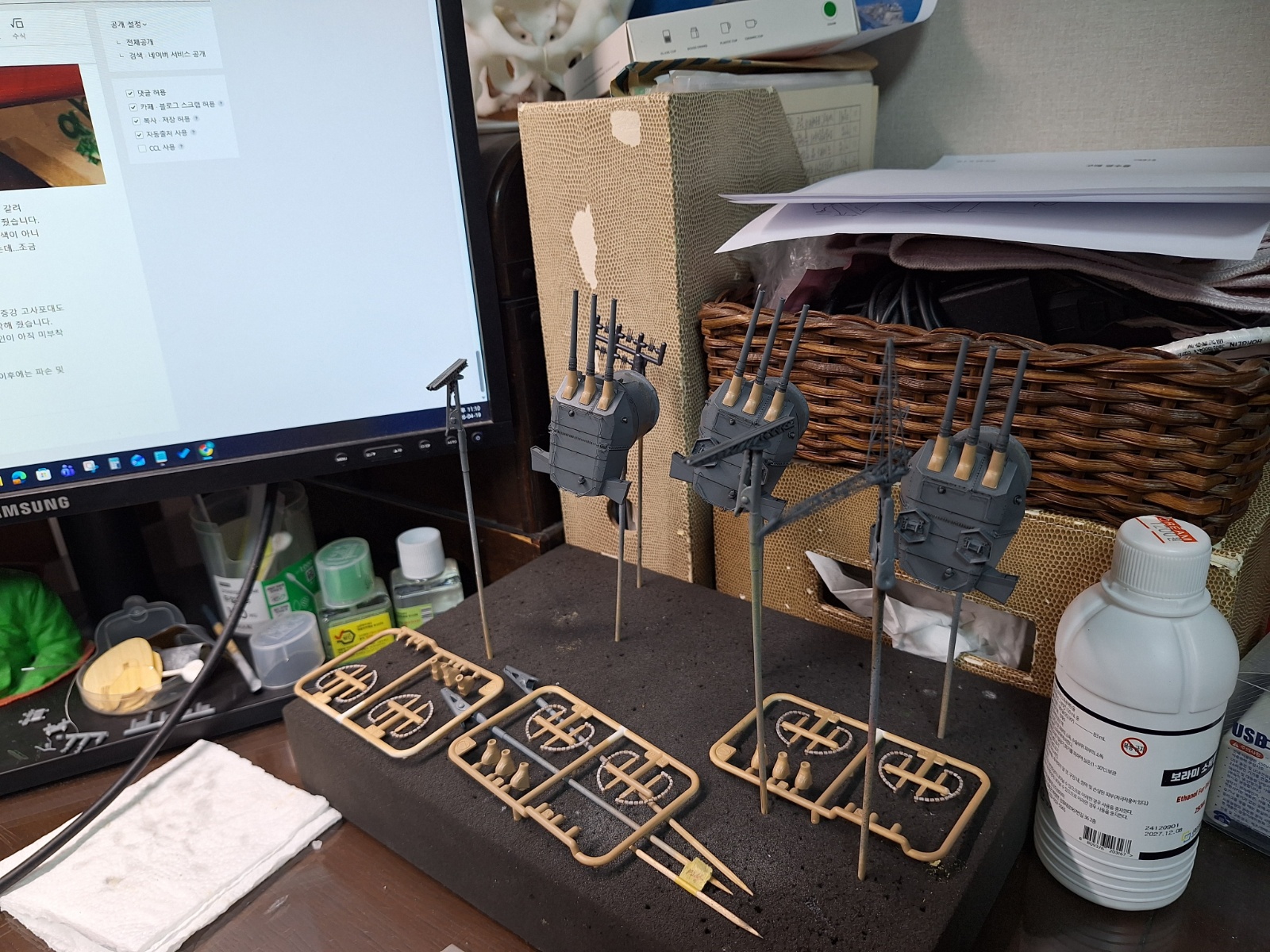 주포도 먹선 넣고 방수포, 메탈 포신 결합해 준 뒤, 반광 마감 후 건조 중입니다.