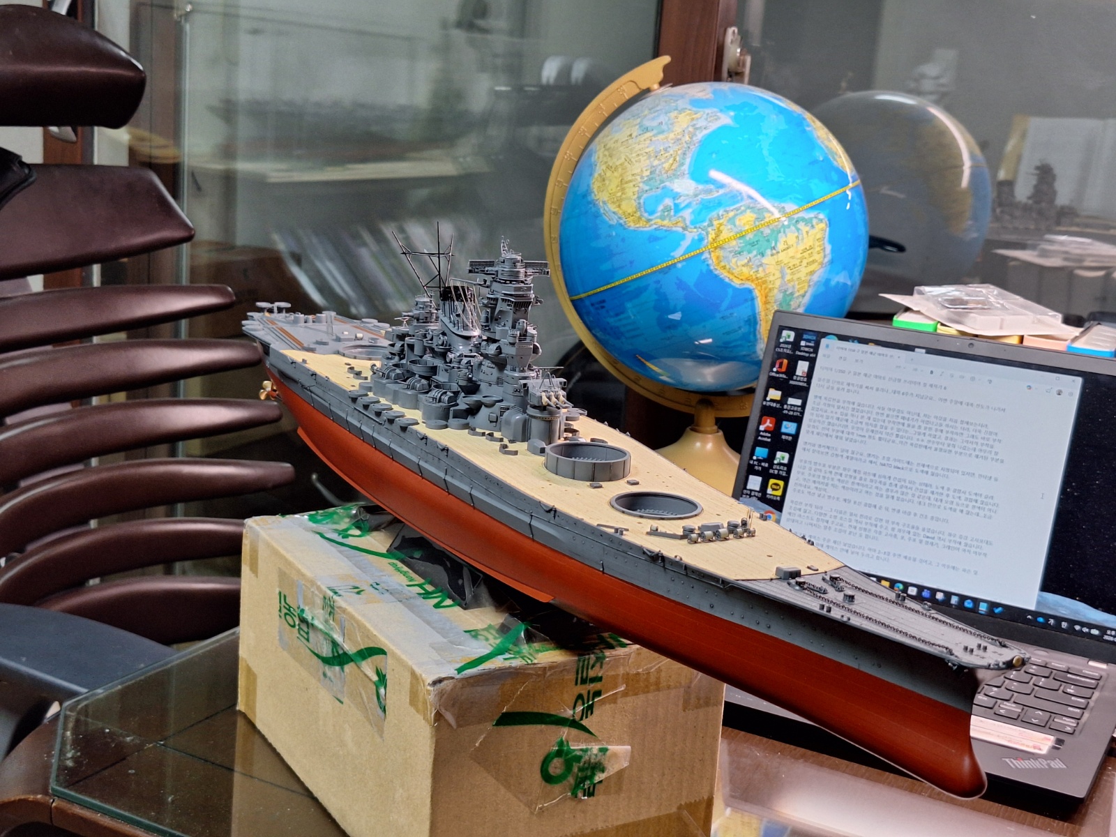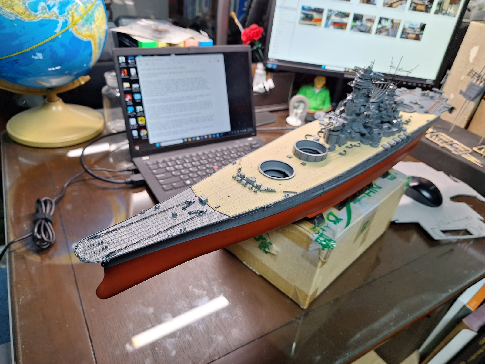 메인 마스트도 접착해 주고요... 현재 상황은 각종 고사총, 포, 주포 및 함재기, 크레인이 아직 미부착 상태이고 나머지는 얼추 조립이 끝난 듯 합니다.
