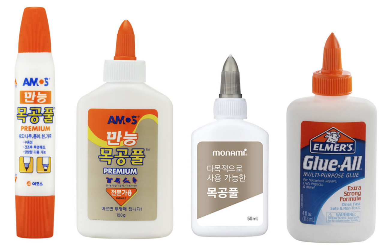 위 사진의 두번째 제품처럼 뚜껑을 돌리는 타입이 편합니다. 바닥에 뿌려두고 이쑤시개로 떠서 바르는 것이 좋지만 병 째로 바르고 싶다면 토출량을 조절할 수 있는 회전식 뚜껑이 편합니다. 모나미도 AMOS와 같은 성분이며 용기 50g 짜리를 팔기 때문에 손에 들고 작업하기 더 편합니다. 외산인 엘머 다목적 본드도 같은 성분입니다.