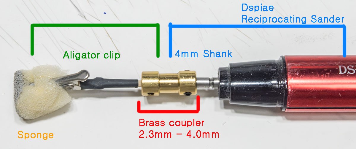 스폰지가 그냥은 안 붙으므로 먼저 DSPIAE 의 4mm 지름 샹크에 맞는 커플러를 구입했습니다. 커플러는 도색용 악어집게를 끼울 수 있도록 2mm 이상의 적당한 지름이면 됩니다. 저는 2mm 2.3mm 3mm 3.17mm 4mm, 5mm, 6mm, 8mm 다 주문했습니다. 일반 평붓도 잘라서 끼울 거거든요.