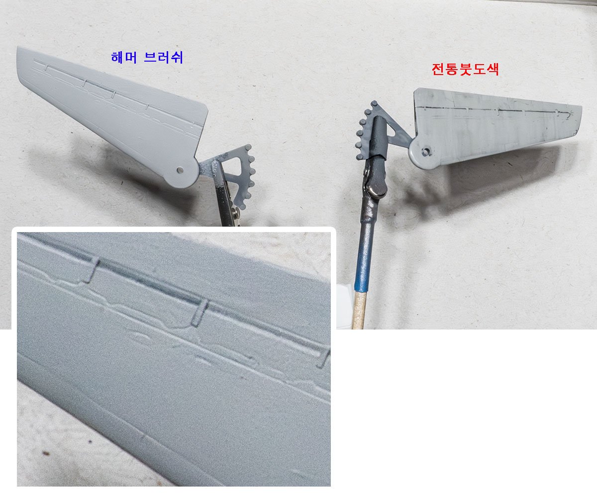 오른쪽은 붓도색 만으로 평탄하게 바르려고 미디엄과 물을 잔뜩 탄 걸 여러겹 올린 결과입니다. 패널라인이 거의 다 먹힐 정도로 레벨링해서 만들었는데 그럼에도 붓자국이 많이 남아 있습니다.