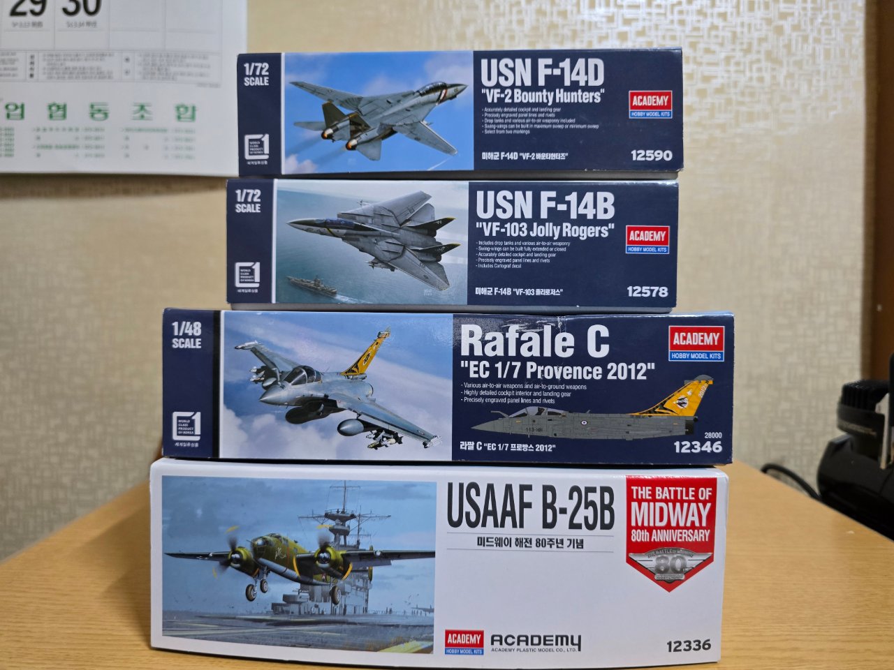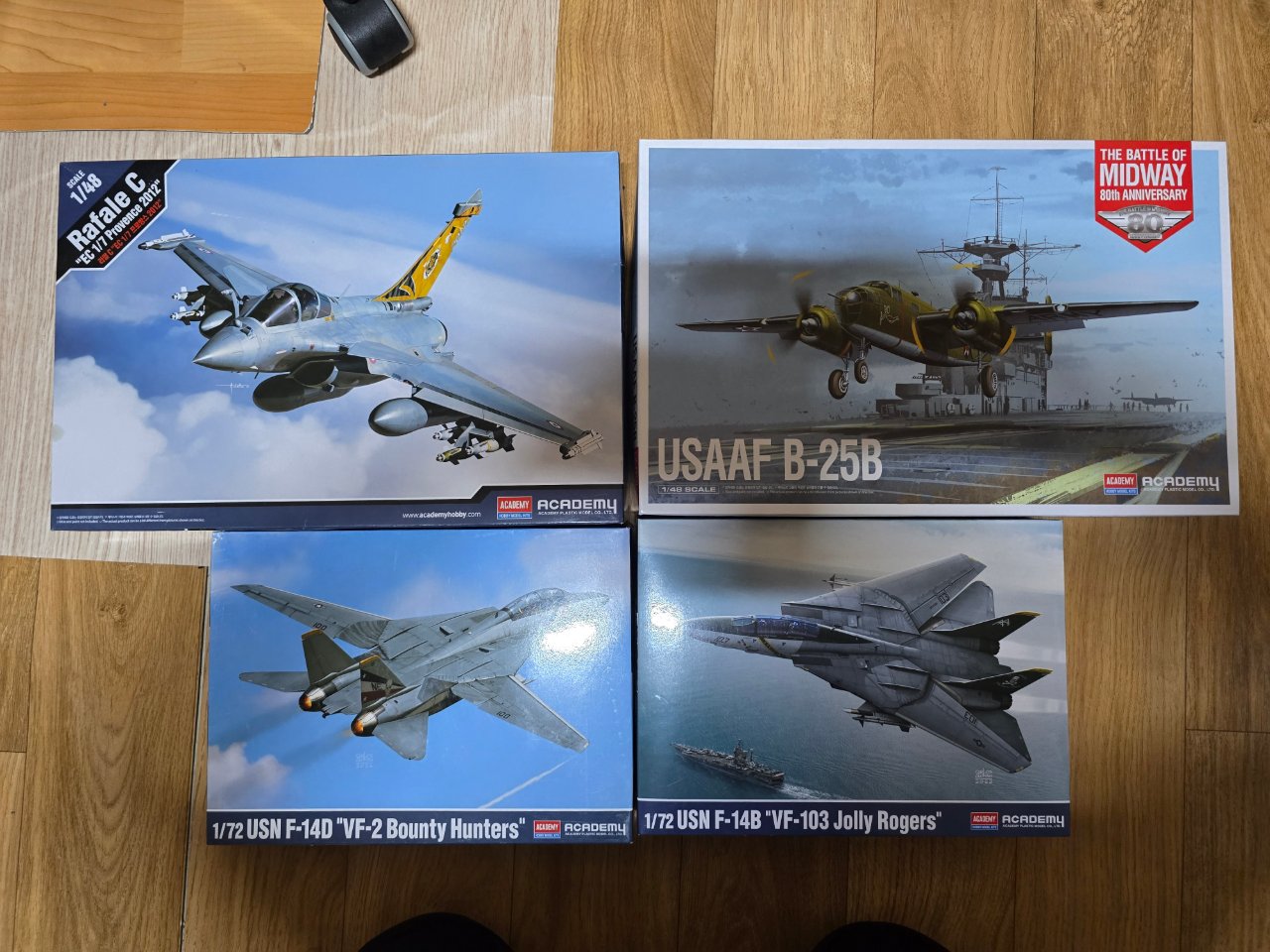 아카데미과학 1:72 F-14B,D 1:48 라팔 C 프로방스, B-25B 4종 셋트로 송료포함 50,000원(오만원)에 판매합니다.