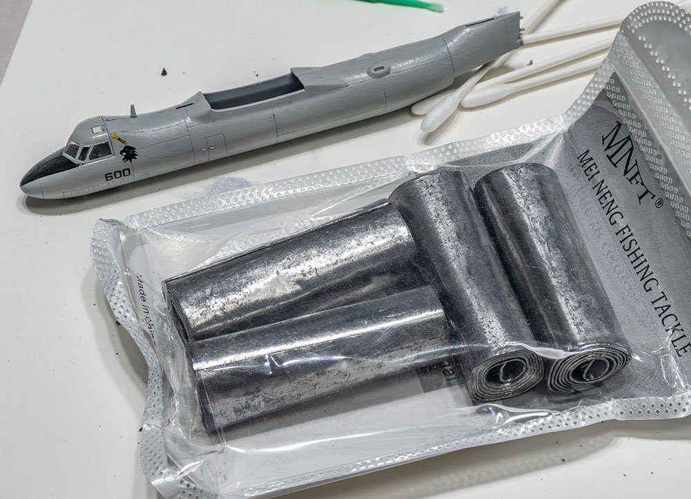 비행기 모형에서 빼먹을 수 없는 기수 부분 무게추는 키트에 포함 안되어 있는 경우가 많습니다. 일부 프리미엄 키트는 철제 큐빅 무게추를 동봉하기도 하지만 대부분 별도로 추가해야 합니다. 그런데 옛날 키트는 철보다 무거운 납을 쓰는 걸 전제로 설계해서 그런지 철 무게추를 넣어도 충분하지 않습니다. 철은 납에 비해 60% 정도로 낮은 밀도라서 같은 무게일 때 철의 덩치가 더 큽니다. 그래서 좁은 공간에 안 들어가죠. 납추를 구하려고 해도 유해물질 규제로 구하기 어려워졌습니다.